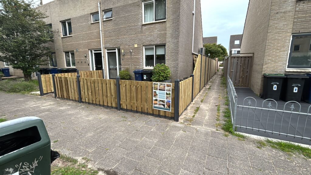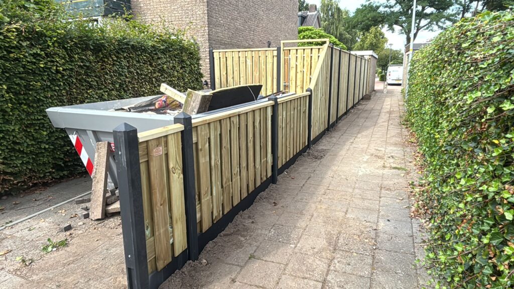 Vandaag, 1 augustus 2024, heb ik opnieuw een schutting geplaatst. Het is een grijsbetonnen schutting met een scherm van 19/21 planken van geïmpregneerd hout.